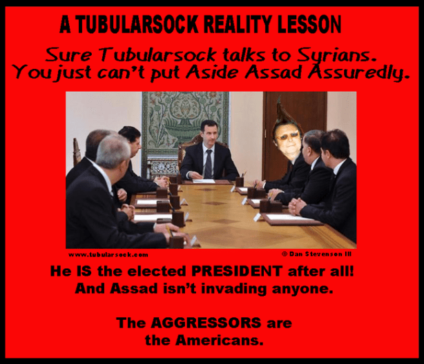 But Tubularsock would say that Secretary of State Rex Tillerson statement is what really takes the cake as when he spouted, “President Bashar al-Assad regime is corrupt, and its methods of governance and economic development have increasingly excluded certain ethnic and religious groups.”